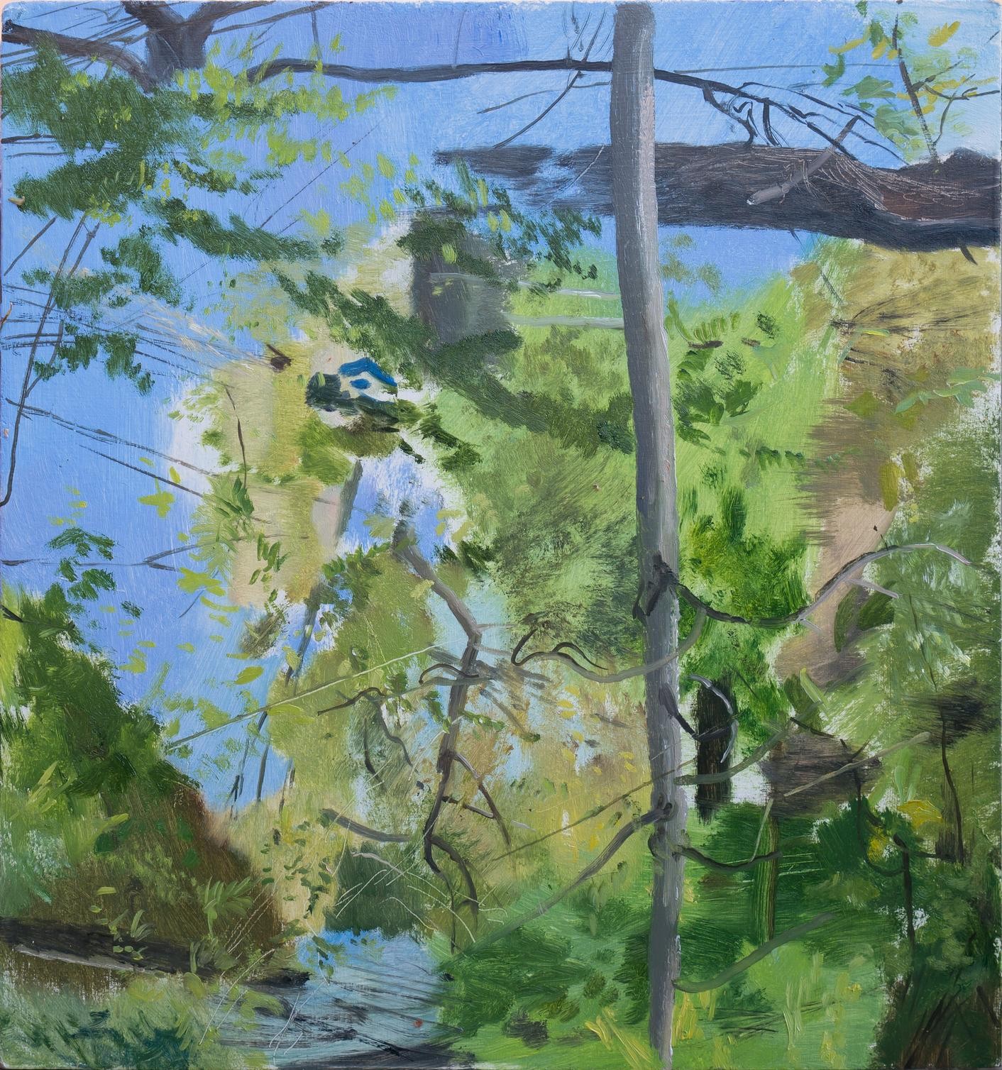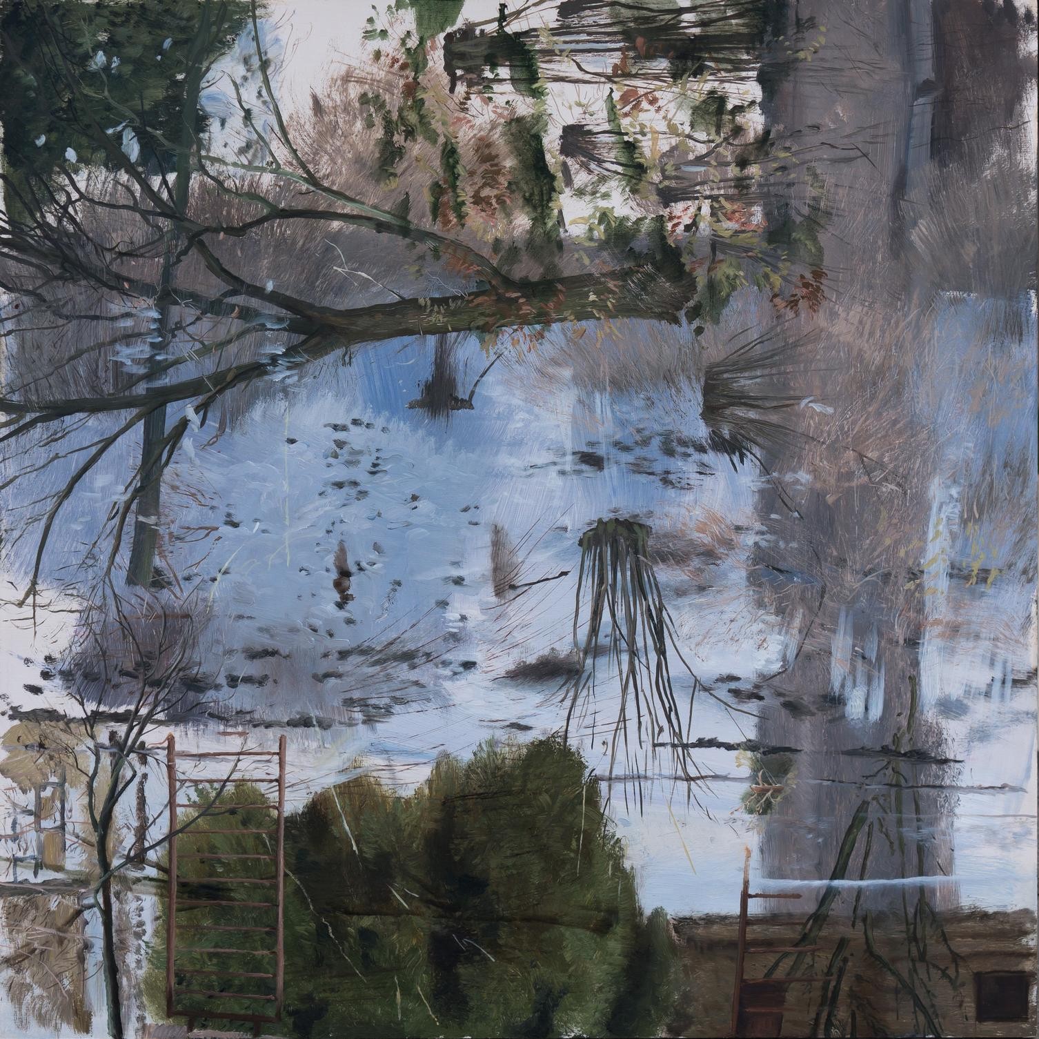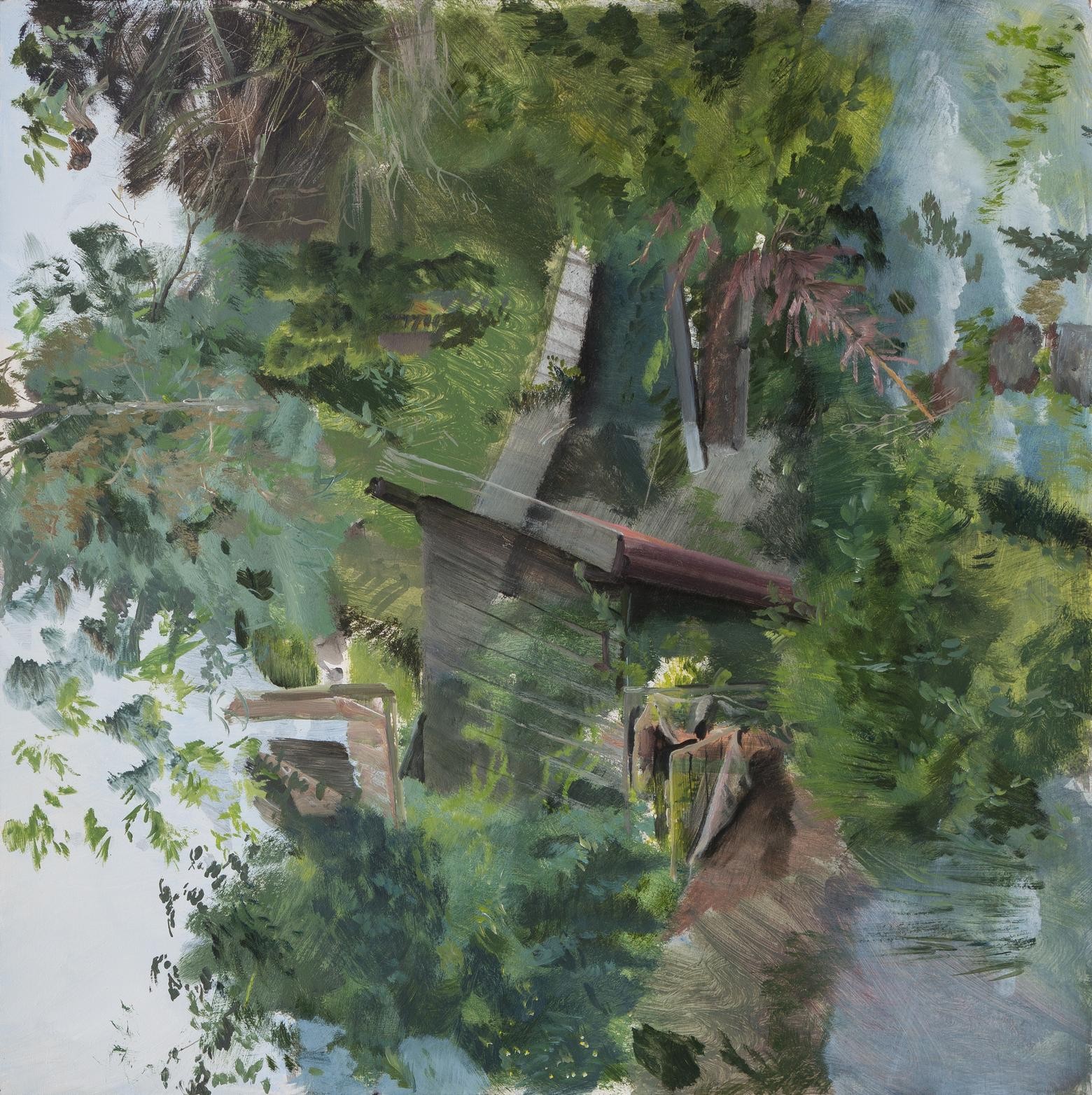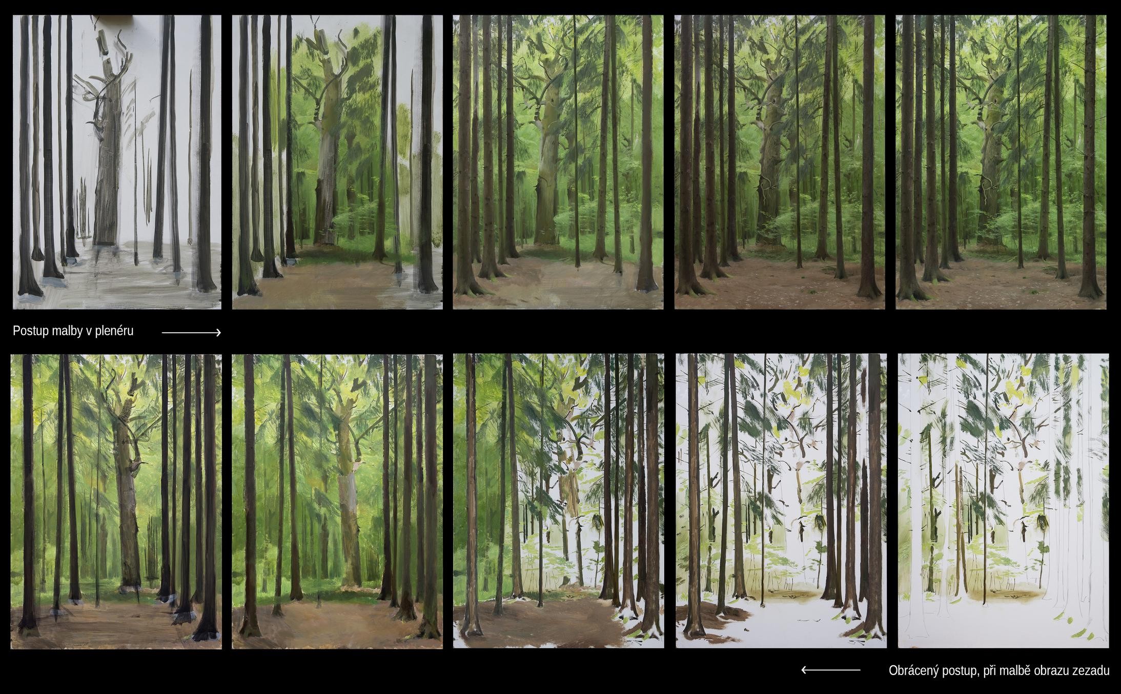 Jde o realizaci mé romantické představy pohledu zevnitř malby. Obraz zezadu je kopií obrazu malovaného v plenéru. Přesně rekonstruuje postup malby, ale v opačném pořadí, od detailů, přes barevnou hmotu, až k podmalbě. Spodní a vrchní vrstvy obrazu mají často podobnou strukturu složenou z linek a detailů, hmota barvy je uprostřed. Přeskládáním obrazových plánů vznikne obrácená iluze prostoru v obraze. Jednotlivé vrstvy, i když jsou překryté, jsou stále patrné. Obraz tak vyžaduje pozornější prohlížení a větší citlivost ke všem detailům malby. Obrácený obraz navíc rozšiřuje vnímání původního obrazu o další pohled.