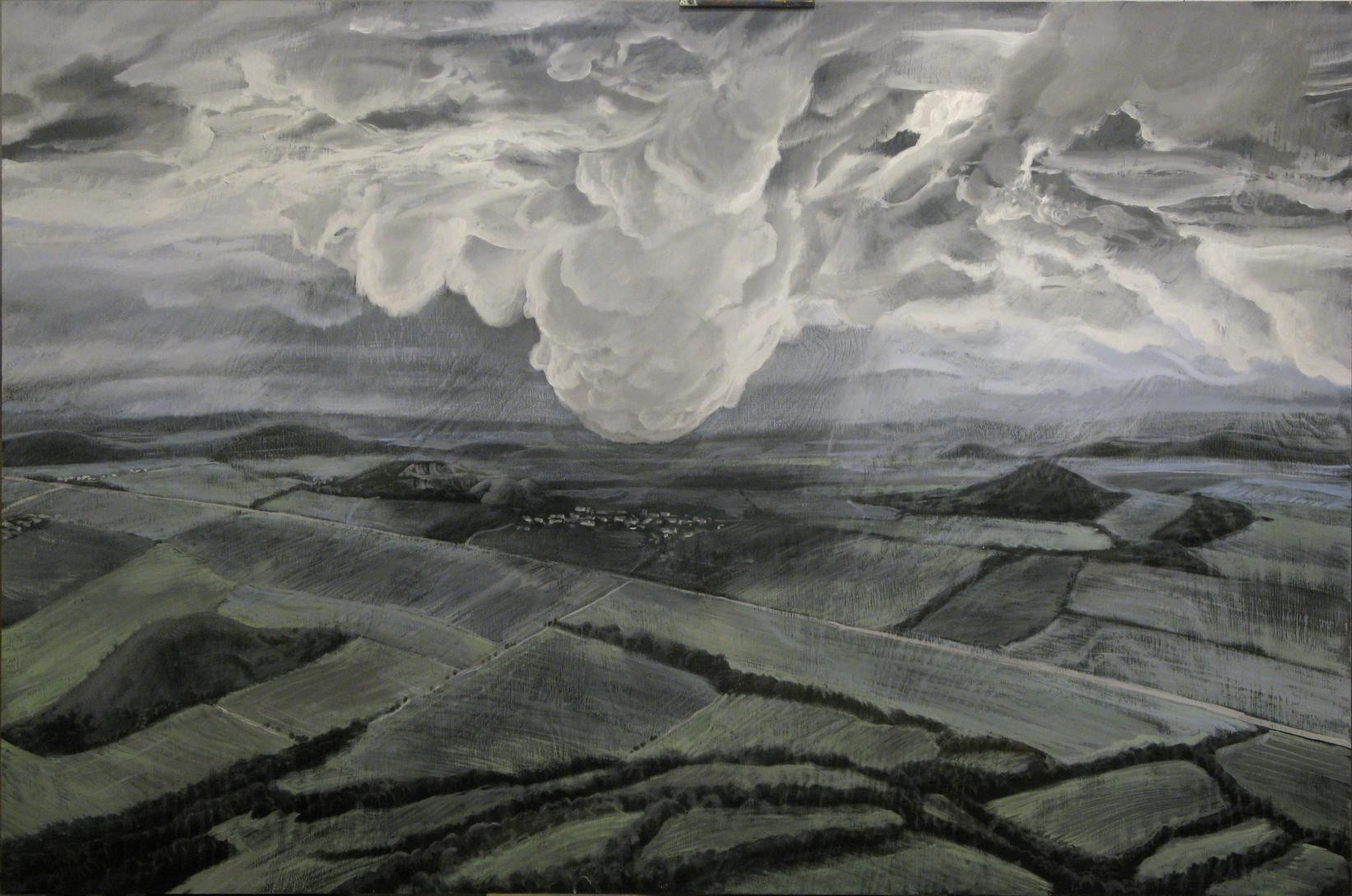 První obrazy jsou malovány čistým práškem TiO2 a na pozdějších obrazech jsem zkoušel průmyslové barvy, které mezitím vyvíjela firma Rokospol.